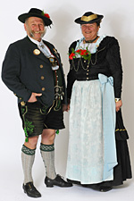 Die Männer tragen einen grünen Velourhut mit Krempe und Band, den eine Schlangenreiherfeder ziert. Die Joppe ist aus grau-grünem Lodenstoff mit großen Hirschhornknöpfen, Stehkragen, Rückenspange und spitzen Joppenlatz. Darunter wird ein weißes Leinenhemd mit einem grünen Gilet (Weste) mit Silberknöpfen und Kettl getragen. Die kurze Lederhose weist grüne Stickereien auf. |